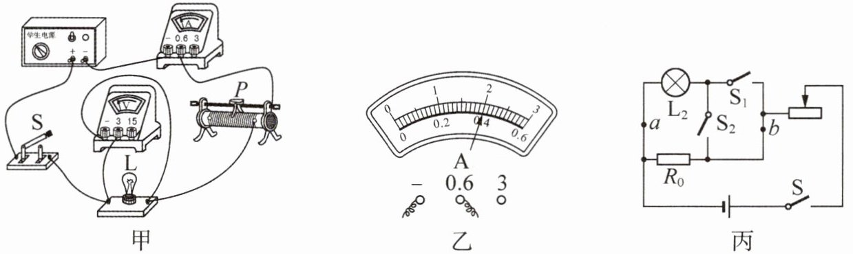 (3) 小明设计了如图丙所示的电路,用一个电压表或电流表测量额定电压为$U_{额}$的小灯泡$L_{2}$的额定功率,已知定值电阻的阻值为$R_{0}、$电源电压未知。请你完成下面的步骤: