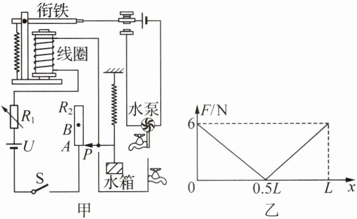 4. (2025·山东泰安一模·10分)如图甲所示为一种自动蓄水装置示意图,轻质弹簧上端固定,下端与木块相连,弹簧下端固定的轻质滑片P可在粗细均匀的金属电阻$R_{2}$上滑动且接触良好,水箱中没有水时,滑片P恰好位于$R_{2}$最下端A处.闭合S,水泵工作,向空水箱里缓慢注水.当滑片P上滑至B处($R_{2}$的中点)时,水面到达设定高度,水泵自动停止注水.弹簧对木块的弹力F与滑片P上滑长度x之间的关系如图乙所示.已知:电阻箱$R_{1}$接入电路的阻值为20Ω,$R_{2}$的总电阻为24Ω,长度为L;当线圈中电流$I≥0.1A$时,衔铁被吸下;$ρ_{水}=1.0×10^{3}kg/m^{3}$,$ρ_{木}=0.6×10^{3}kg/m^{3}$,g取10N/kg,弹簧始终处于弹性范围,不考虑线圈的电阻和滑片P滑动时的摩擦.