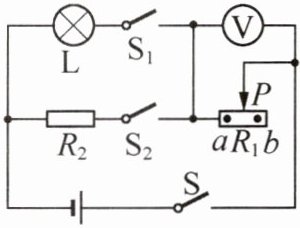 3. (2025·江苏扬州模拟·8分)如图所示电路,电源电压保持不变,$R_{2}$为定值电阻,灯泡L标有“12V 9W”字样,滑动变阻器$R_{1}$的最大阻值为160Ω,电压表量程为0~15V.闭合开关S、$S_{1}$,断开$S_{2}$,$R_{1}$接入电路的阻值为8Ω时,灯泡L恰好正常发光;闭合开关S、$S_{2}$,断开$S_{1}$,将$R_{1}$的滑片P滑至a点时,$R_{1}$接入电路的阻值为$R_{a}$,电压表示数为$U_{a}$,将$R_{1}$的滑片P滑至b点时,$R_{1}$接入电路的阻值为$R_{b}$,电压表示数为$U_{b}$,此时$R_{1}$的功率$P_{b}=2.8W$,且$R_{a}:R_{b}=4:7$,$U_{a}:U_{b}=6:7$.求: