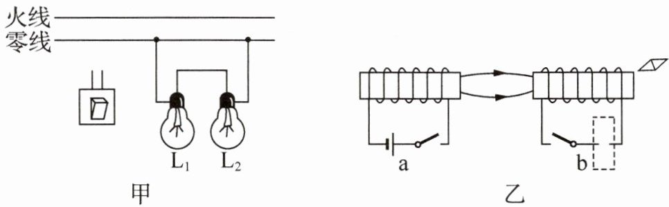 (2) (2025·江苏无锡模拟)闭合开关,a、b两个通电螺线管之间的磁感线如图乙所示. 将通电螺线管b的电池符号画在虚线框内并标出静止小磁针的N极.