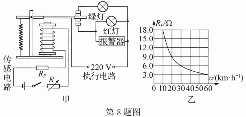 答案:8.S 4 减小电阻箱阻值 解析:由图甲可知,电流从通电螺线管上端流入、下端流出,由安培定则可知,电磁铁上端为S极;由图乙可知,当速度为$30\ km/h$时,可变电阻的阻值$R_{P}=6\ \Omega$,由欧姆定律可得启动报警时电路的总电阻$R_{总}=\frac{U}{I}=\frac{12\ V}{1.2\ A}=10\ \Omega$,则电阻箱的阻值$R=R_{总}-R_{P}=10\ \Omega-6\ \Omega=4\ \Omega$;由图乙可知,速度越小,$R_{P}$阻值越大,在其他条件不变时,启动报警时传感电路的总电阻不变,因此需要减小电阻箱阻值,在速度更小时就能启动报警.