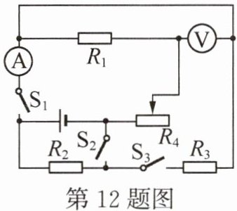 答案:12. 6 30 12 解析:由电路图可知,当闭合开关$S_1$,断开$S_2$、$S_3$,滑片位于最右端时,$R_1$和$R_4$串联,滑动变阻器接入电路的阻值$R_4 = 20 \Omega$,$R_4$的电功率$P_4 = 0.8 W$,由$P = I^2R$可得,此时电路中的电流$I = \sqrt{\frac{P_4}{R_4}} = \sqrt{\frac{0.8 W}{20 \Omega}} = 0.2 A$,则电源电压$U = I(R_1 + R_4) = 0.2 A×(R_1 + 20 \Omega)$,由$R_1:R_3 = 1:3$可知$R_3 = 3R_1$,当开关$S_1$、$S_2$、$S_3$均闭合,滑片位于最左端时,$R_1$、$R_2$、$R_3$并联,电流表测通过$R_1$、$R_3$的电流之和,则$I_{13} = I_1 + I_3 = 0.8 A$,即$\frac{U}{R_1} + \frac{U}{R_3} = 0.8 A$,则$\frac{U}{R_1} + \frac{U}{3R_1} = 0.8 A$,化简得$U = 0.6 A×R_1$,因为电源电压恒定,所以$0.2 A×(R_1 + 20 \Omega) = 0.6 A×R_1$,解得$R_1 = 10 \Omega$、$U = 6 V$,所以$R_3 = 3R_1 = 3×10 \Omega = 30 \Omega$;闭合开关$S_3$,断开$S_1$、$S_2$,将滑片位于最左端时,$R_1$、$R_2$、$R_3$串联,电路的总电阻$R_{总} = \frac{U}{I'} = \frac{6 V}{0.1 A} = 60 \Omega$,则$R_2$的阻值$R_2 = R_{总} - R_1 - R_3 = 60 \Omega - 10 \Omega - 30 \Omega = 20 \Omega$,所以,1 min 内电流通过电阻$R_2$所做的功$W_2 = I'^2R_2t = (0.1 A)^2×20 \Omega×60 s = 12 J$.