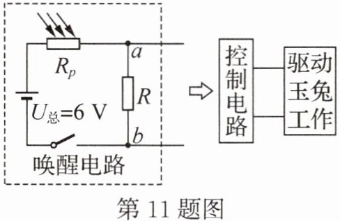 综合实践 (2025·江苏苏州模拟·4分)2024年5月3日17时27分,嫦娥六号探测器由长征五号遥八运载火箭在中国文昌航天发射场发射升空. 为应对月球的光照环境,小海在地球上利用阻值随光照强度变化的光敏电阻R_p设计了“模拟唤醒系统”,如图所示,R为定值电阻,若a、b两端的电压U_ab等于3V时控制电路启动,此时R_p的大小为$R_0;$U_ab等于1V时控制系统彻底关机,此时R_p的大小为$R'_0,$则$R_0$:$R'_0=$
