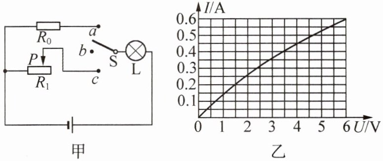 13. (9分)图甲为某同学设计的调光灯电路,S为选择开关,当S接触a点时,小灯泡L正常发光但不能调光;当S接触b点时,电路断开;当S接触c点,滑片P调至最右端时,灯泡的实际功率为额定功率的一半. 已知滑动变阻器R₁的铭牌上标有“1A”字样,小灯泡的额定电压为6V,其电流与电压的关系如图乙所示,电源电压恒为9V. 求: