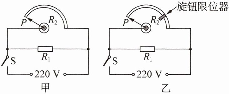 (2) 小语发现图甲的电路有安全隐患,随即在$R_2$上安装了一个旋钮限位器(仅限制旋钮位置,不影响电阻阻值),如图乙所示;为保证电路安全,限位器应使$R_2$接入电路的阻值不小于多少?