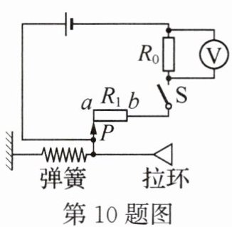 答案:10.1 2:3 3 不均匀 解析:由图可知,$R_1$、$R_0$串联,电压表测$R_0$两端的电压。滑片$P$在$b$端时,拉力最大,即$F = 10\mathrm{ N}$,由于拉力$F$从$0\mathrm{ N}$到$10\mathrm{ N}$均匀变化,所以当$F = 5\mathrm{ N}$时,滑片$P$在$ab$中点位置,设$R_1$的最大阻值为$R$,则此时$R_1$接入电路的阻值$R_1=\frac{1}{2}R$,由题意知此时电压表示数即$R_0$两端电压$U_0 = 1.5\mathrm{ V}$,则此时$R_1$两端电压$U_1 = U - U_0 = 3\mathrm{ V}-1.5\mathrm{ V}=1.5\mathrm{ V}$,由串联分压可得$R_0:R_1 = U_0:U_1 = 1.5\mathrm{ V}:1.5\mathrm{ V}=1:1$,由此得出$R_0=\frac{1}{2}R$,当$F = 0\mathrm{ N}$时,$R_1 = R$,$U_0^\prime:U_1^\prime = R_0:R_1=\frac{1}{2}R:R = 1:2$,所以$U_0^\prime=\frac{1}{2}U_1^\prime$,由$U = U_1^\prime+\frac{1}{2}U_1^\prime=\frac{3}{2}U_1^\prime$可得,$U_1^\prime=\frac{2}{3}U=\frac{2}{3}×3\mathrm{ V}=2\mathrm{ V}$,则$U_0^\prime=U - U_1^\prime=3\mathrm{ V}-2\mathrm{ V}=1\mathrm{ V}$,即电压表示数为$1\mathrm{ V}$;由电功率公式可得,$R_1$消耗的电功率与电路总功率之比$\frac{P_1}{P_{总}}=\frac{U_1^\prime I}{UI}=\frac{U_1^\prime}{U}=\frac{2\mathrm{ V}}{3\mathrm{ V}}=\frac{2}{3}$;当拉力为$10\mathrm{ N}$时,滑片$P$在$b$端,此时$R_1 = 0$,所以此时电压表示数等于电源电压$3\mathrm{ V}$,则拉力计的$10\mathrm{ N}$应标在电压表的$3\mathrm{ V}$刻度线位置;$R_1$接入电路的阻值与拉力$F$的关系是一次函数,设为$R_1 = R - kF$,由欧姆定律可得,电压表的示数$U_0 = IR_0=\frac{U}{R - kF+R_0}R_0$,则$U_0$与$F$是反比例函数关系,所以拉力计的刻度是不均匀的。