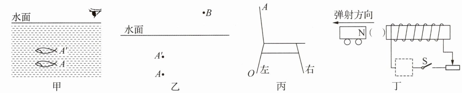(1) (2025·四川南充)如图所示,图甲是人在岸边观察水中鱼时的情景,在图乙中完成光路图.(其中A表示鱼的位置,$A{}^{\prime }$表示鱼的像的位置,B表示人眼的位置,可以不画法线,保留作图痕迹)