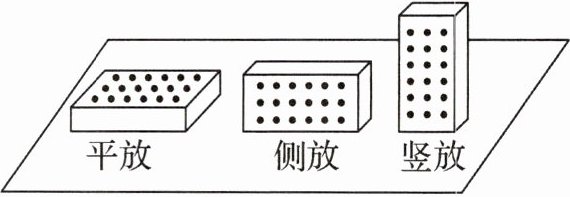 答案:5.C 解析:砖对水平地面的压力等于砖的重力,即$F=G=mg=1.5\mathrm{ kg}×10\mathrm{ N/kg}=15\mathrm{ N}$,由$p=\frac{F}{S}$可得,平放时水平地面的受力面积即砖平放时底面实心部分的面积$S_{实}=\frac{F}{p}=\frac{15\mathrm{ N}}{1000\mathrm{ Pa}}=1.5×10^{-2}\mathrm{ m}^2=150\mathrm{ cm}^2$,已知圆孔总体积占砖总体积的$\frac{1}{4}$,则砖实心部分的体积占总体积的$\frac{3}{4}$,由$V=Sh$可知,平放时底面的总面积$S_{平}=\frac{4}{3}S_{实}=\frac{4}{3}×150\mathrm{ cm}^2=200\mathrm{ cm}^2$,已知砖三条棱长之比为$1:2:4$,即$c:b:a=1:2:4$,则砖侧放时与地面的接触面积$S_{侧}=\frac{1}{2}S_{平}=\frac{1}{2}×200\mathrm{ cm}^2=100\mathrm{ cm}^2$,故A错误;又因为$S_{侧}=ac=4c× c=100\mathrm{ cm}^2$,解得$c=5\mathrm{ cm}$,则$a=20\mathrm{ cm},b=10\mathrm{ cm}$,该砖实心部分的体积$V_{实}=\frac{3}{4}V_{总}=\frac{3}{4}abc=\frac{3}{4}×20\mathrm{ cm}×10\mathrm{ cm}×5\mathrm{ cm}=750\mathrm{ cm}^3$,则该砖实心部分的材质密度$\rho=\frac{m}{V_{实}}=\frac{1.5×10^{3}\mathrm{ g}}{750\mathrm{ cm}^3}=2\mathrm{ g/cm}^3$,故B错误;将砖竖放入容器中时,砖恰好有一半浸入水中,则此时水的深度$h=\frac{1}{2}a=\frac{1}{2}×20\mathrm{ cm}=10\mathrm{ cm}$,容器中水的体积$V_{水}=S_{容}h-\frac{1}{2}V_{实}=250\mathrm{ cm}^2×10\mathrm{ cm}-\frac{1}{2}×750\mathrm{ cm}^3=2125\mathrm{ cm}^3$,则砖未放入容器中时水的深度$h'=\frac{V_{水}}{S_{容}}=\frac{2125\mathrm{ cm}^3}{250\mathrm{ cm}^2}=8.5\mathrm{ cm}$,故C正确;砖竖放入容器中时,排开水的体积$V_{排}=\frac{1}{2}V_{实}=\frac{1}{2}×750\mathrm{ cm}^3=375\mathrm{ cm}^3$,受到的浮力$F_{浮}=\rho_{水}V_{排}g=1.0×10^{3}\mathrm{ kg/m}^3×375×10^{-6}\mathrm{ m}^3×10\mathrm{ N/kg}=3.75\mathrm{ N}$,此时砖对容器底的压力$F'=G-F_{浮}=15\mathrm{ N}-3.75\mathrm{ N}=11.25\mathrm{ N}$,砖竖放时容器底的受力面积$S=S_{竖}=bc=10\mathrm{ cm}×5\mathrm{ cm}=50\mathrm{ cm}^2$,则砖对容器底的压强$p'=\frac{F'}{S}=\frac{11.25\mathrm{ N}}{50×10^{-4}\mathrm{ m}^2}=2250\mathrm{ Pa}$,故D错误.