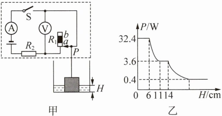 答案:14.(1)$10\Omega$ (2)$80\Omega$ (3)$21.5\mathrm{ cm}$ 解析:由图甲可知,闭合开关S,滑动变阻器$R_1$与定值电阻$R_2$串联,电压表测$R_1$两端的电压,电流表测电路中电流.(1)未注水时,滑片P刚好在$R_1$的下端,$R_1$接入电路的阻值为$0$,电路为$R_2$的简单电路,由图乙可知,此时$R_2$的电功率最大为$P_{2max}=32.4\mathrm{ W}$,由$P=\frac{U^2}{R}$可得,$R_2$的阻值$R_2=\frac{U^2}{P_{2max}}=\frac{(18\mathrm{ V})^2}{32.4\mathrm{ W}}=10\Omega$.(2)$R_1$接入电路的阻值最大时,电路的总电阻最大,由欧姆定律可知,电路中电流最小,由$P=I^2R$可知,$R_2$的电功率最小,由图乙可知,$R_2$的最小电功率$P_{2min}=0.4\mathrm{ W}$,此时电路中的电流$I_{min}=\sqrt{\frac{P_{2min}}{R_2}}=\sqrt{\frac{0.4\mathrm{ W}}{10\Omega}}=0.2\mathrm{ A}$,由欧姆定律可得,电路的总电阻$R_{max}=\frac{U}{I_{min}}=\frac{18\mathrm{ V}}{0.2\mathrm{ A}}=90\Omega$,则$R_1$的最大阻值$R_{1max}=R_{max}-R_2=90\Omega-10\Omega=80\Omega$.(3)由图乙可知,水深为$11\mathrm{ cm}$时,$R_2$的电功率$P_2=3.6\mathrm{ W}$,由$P=I^2R$可得,此时电路中的电流$I=\sqrt{\frac{P_2}{R_2}}=\sqrt{\frac{3.6\mathrm{ W}}{10\Omega}}=0.6\mathrm{ A}$,电路的总电阻$R=\frac{U}{I}=\frac{18\mathrm{ V}}{0.6\mathrm{ A}}=30\Omega$,$R_1$接入电路的阻值$R_1=R-R_2=30\Omega-10\Omega=20\Omega$,由图乙可知,水深为$6∼11\mathrm{ cm}$时,滑片P从$R_1$下端移到a点,滑片移动的距离为$11\mathrm{ cm}-6\mathrm{ cm}=5\mathrm{ cm}$,即a点以下部分的长度为$5\mathrm{ cm}$,由串联分压可知,$R_1$接入电路的阻值越大,电压表示数越大,所以,电压表示数最大时$R_1$接入电路的阻值最大,此时水位的深度最大,电压表选用$0∼15\mathrm{ V}$量程,最大示数为$15\mathrm{ V}$,由串联电路的电压规律可得,此时$R_2$两端的电压$U_{2min}=U-U_{1max}=18\mathrm{ V}-15\mathrm{ V}=3\mathrm{ V}$,电路中的电流$I'=\frac{U_{2min}}{R_2}=\frac{3\mathrm{ V}}{10\Omega}=0.3\mathrm{ A}$,$R_1$接入电路的阻值$R_{1}'=\frac{U_{1max}}{I'}=\frac{15\mathrm{ V}}{0.3\mathrm{ A}}=50\Omega$,则$R_1$接入电路的电阻部分的长度$L=\frac{5\mathrm{ cm}}{20\Omega}×50\Omega=12.5\mathrm{ cm}$,由图乙可知,水深为$11∼14\mathrm{ cm}$时,滑片P从$R_1$的a点移到b点,则$ab$段铜导线的长度为$14\mathrm{ cm}-11\mathrm{ cm}=3\mathrm{ cm}$,滑片从下端向上移动的距离为$12.5\mathrm{ cm}+3\mathrm{ cm}=15.5\mathrm{ cm}$,所以水位的最大深度$H=15.5\mathrm{ cm}+6\mathrm{ cm}=21.5\mathrm{ cm}$.