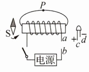 上分点三 如图所示,将某发光二极管的两极接入电路的$ a $、$ b $两点,闭合开关时,通电螺线管旁边小磁针的$ S $极向右偏转. 下列判断不正确的是 (