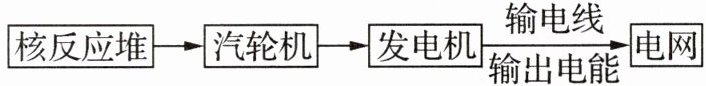 核反应堆→汽轮机→发电机→输电线输出电能→电网