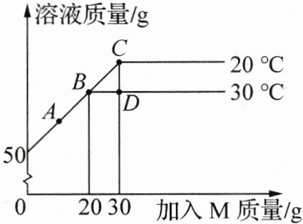 解析:(3) 由题图可知,随着温度升高,溶质M的溶解能力减弱,升温至40℃以上,有晶体析出,溶液仍为饱和溶液,故A不符合题意;30℃时,50g水中最多能溶解20gM,D点对应溶液溶质的质量为20g,向溶液中再加25g水,25g水最多能溶解10g溶质,所得溶液是恰好饱和的溶液,故B不符合题意;随着温度降低,溶质M的溶解能力增强,降低温度至20℃以下,能将D点对应溶液转化为不饱和溶液,故C符合题意。(4) 由题图可知,相等质量的水中,20℃时饱和溶液的质量比30℃时大,说明温度升高,M溶于水中的量更少,即饱和溶液降温时可能不会析出晶体,应采用蒸发结晶的方法得到M晶体。