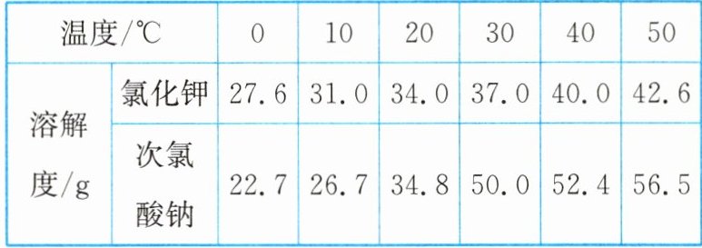 解析:(3) 两种物质的溶解度都是随着温度的降低而减小,且次氯酸钠的溶解度受温度变化的影响较大,则50℃时,将氯化钾和次氯酸钠的饱和溶液各100g分别降温至20℃,两溶液仍然饱和,且次氯酸钠析出的晶体多,则溶液的质量小,氯化钾溶液析出的晶体少,溶液的质量大,所得两溶液的质量:氯化钾溶液>次氯酸钠溶液。