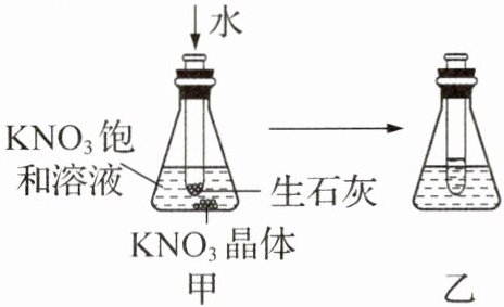 创新实验 (2024·四川乐山)某同学设计如图甲所示实验,研究KNO₃的溶解度随温度的变化。当向试管中加入一定量的水后,锥形瓶中的KNO₃发生如图乙所示的变化。下列说法正确的是(