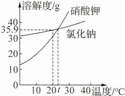 答案:3. C 解析:选项未指明温度,无法比较溶解度,故A错误;由题图可知,20℃时,氯化钠的溶解度为35.9g,氯化钠饱和溶液的溶质质量分数为$\frac{35.9g}{100g + 35.9g}×100\% ≈ 26.4\%$,不能配制质量分数为30%的氯化钠溶液,故B错误;由题图可知,硝酸钾和氯化钠的溶解度均随温度的升高而增大,硝酸钾的溶解度受温度变化的影响较大,氯化钠的溶解度受温度变化的影响较小,若硝酸钾中混有少量的氯化钠,可采用降温结晶的方法提纯硝酸钾,故C正确;由题图可知,t℃时,氯化钠和硝酸钾的溶解度相等,该温度下两种物质的饱和溶液中溶质质量分数相等,将t℃时两种物质的饱和溶液升温至40℃,氯化钠、硝酸钾的溶解度均增大,均变为不饱和溶液,溶剂和溶质的质量均不变,溶液的溶质质量分数不变,则升温后氯化钠溶液、硝酸钾溶液的浓度仍相等,故D错误。