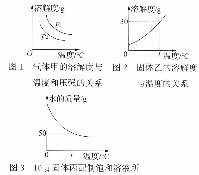 答案:7. C 解析:温度一定的条件下,压强越大,气体物质的溶解度越大,所以题图1中p₁大于p₂,故A错误;t℃时,固体乙物质的溶解度是30g,固体丙物质的溶解度是20g,故B错误;随温度升高,溶解10g固体丙需要的溶剂减少,所以物质丙的溶解度随温度的升高而增大,故C正确;气体甲的溶解度随温度的升高而减小,故D错误。