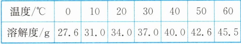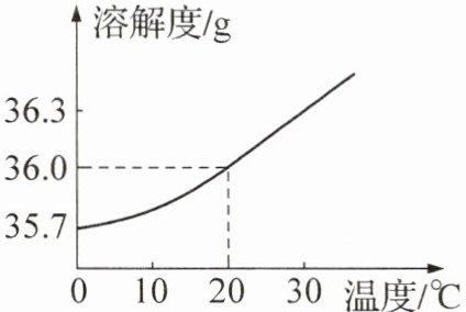 解析:(2)由题图可知,$20^{\circ}C$时氯化钠的溶解度为36.0g,此温度下,将9g氯化钠溶解到25g水中,恰好完全溶解,可配得氯化钠的饱和溶液;保持温度不变,蒸发部分溶剂,析出固体,仍然是饱和溶液,由于温度不变,因此溶解度不变,该溶液溶质的质量分数不变。
