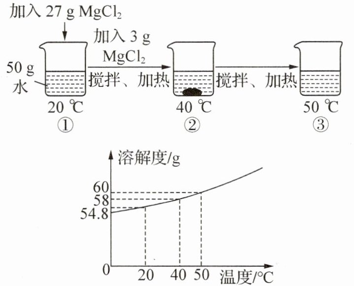 答案:9. C 解析:$20^{\circ}C$时,氯化镁的溶解度为54.8g,大于10g,氯化镁固体是易溶性物质,故A正确;$40^{\circ}C$时,氯化镁的溶解度为58g,$40^{\circ}C$时,50g水中最多能溶解29g氯化镁,则烧杯②的溶液中溶质的质量为29g,故B正确;$50^{\circ}C$时,氯化镁的溶解度为60g,则$50^{\circ}C$时,50g水中最多能溶解30g氯化镁,烧杯③的溶液恰好为该温度下的饱和溶液,故C错误;烧杯①②③中溶剂的质量相同,溶质的质量为① < ② < ③,则各烧杯溶液中溶质的质量分数大小关系为① < ② < ③,故D正确。