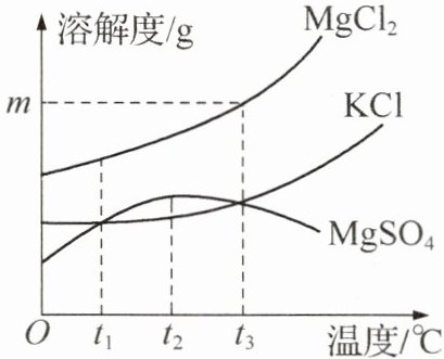 解析:(3)$t_{3}^{\circ}C$时,氯化镁的溶解度为m g,$t_{3}^{\circ}C$时,向100g 30%的$MgCl_{2}$溶液中加入40g $MgCl_{2}$固体后恰好变为饱和溶液,则$\frac{100g×30\% + 40g}{100g + 40g}×100\% = \frac{mg}{mg + 100g}×100\%$,解得$m = 100$。(4)相同温度下,溶解度越大,其饱和溶液的溶质质量分数越大,$t^{\circ}C$时三种物质饱和溶液的溶质质量分数大小关系为$MgCl_{2} > MgSO_{4} > KCl$,说明$t^{\circ}C$时三种物质的溶解度大小关系为$MgCl_{2} > MgSO_{4} > KCl$,由溶解度曲线图可知,t的范围是$t_{1} < t < t_{3}$。