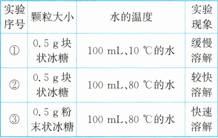 在两个完全相同的烧杯中,分别加入 100 mL 相同温度的水,再同时向烧杯中各加入一药匙颗粒大小相同的冰糖,用玻璃棒搅拌其中一个烧杯内的液体,观察两烧杯中冰糖溶解的快慢