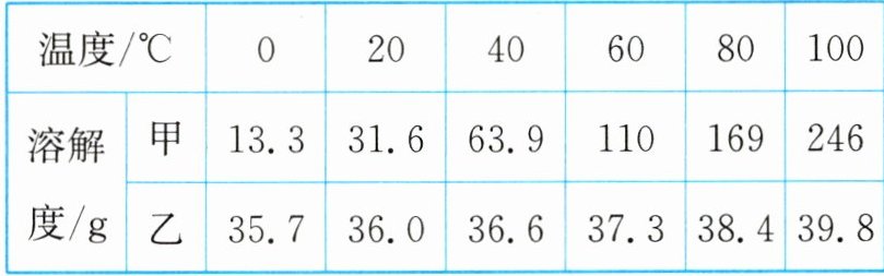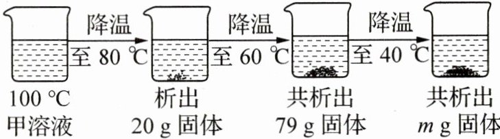 解析:(3)由题图可知,由$80^{\circ}C$降温至$60^{\circ}C$析出固体的质量为79g - 20g = 59g,结合题表中数据可知,此溶液中溶剂的质量为100g,由$100^{\circ}C$降温到$80^{\circ}C$析出固体的质量为20g,则$100^{\circ}C$甲溶液中溶质的质量为169g + 20g = 189g,$100^{\circ}C$甲的溶解度为246g,则此时甲溶液为不饱和溶液;$40^{\circ}C$时,甲的溶解度为63.9g,则降温至$40^{\circ}C$时,共析出固体的质量为189g - 63.9g = 125.1g。