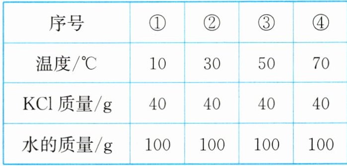 答案:12. D 解析:$10^{\circ}C$和$30^{\circ}C$时氯化钾的溶解度均小于40g,所以①②均是饱和溶液,故A错误;$50^{\circ}C$和$70^{\circ}C$时,氯化钾的溶解度均大于40g,40g氯化钾全部溶解,所以溶质质量:③ = ④,故B错误;$50^{\circ}C$时,氯化钾的溶解度大于40g,40g氯化钾全部溶解,所以③中溶质质量分数为$\frac{40g}{100g + 40g}×100\%≈28.6\%$,故C错误;$70^{\circ}C$时,氯化钾的溶解度大于40g,40g氯化钾全部溶解,所以④中溶质与溶剂的质量比为40g : 100g = 2 : 5,故D正确。