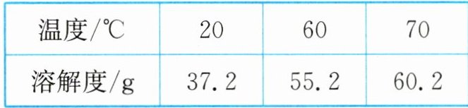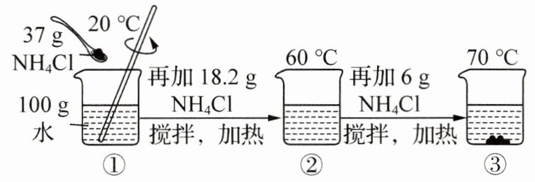 答案:11. C 解析:$20^{\circ}C$时,氯化铵的溶解度为37.2g,则向100g水中加入37g $NH_{4}Cl$后,能全部溶解,烧杯①中溶液的溶质质量分数为$\frac{37g}{37g + 100g}×100\%≈27\%$,故A错误;$60^{\circ}C$时,氯化铵的溶解度为55.2g,烧杯②中$NH_{4}Cl$的质量为37g + 18.2g = 55.2g,因此,烧杯②中的溶液恰好为该温度下的饱和溶液,故B错误;烧杯②中的溶液为$60^{\circ}C$时氯化铵的饱和溶液,氯化铵的溶解度随温度的降低而减小,则将烧杯②中的溶液降温到$20^{\circ}C$时会析出固体,故C正确;$70^{\circ}C$时,氯化铵的溶解度为60.2g,即该温度下的100g水中最多能溶解60.2g氯化铵,烧杯③中$NH_{4}Cl$的质量为37g + 18.2g + 6g = 61.2g > 60.2g,因此烧杯③的溶液质量是160.2g,故D错误。