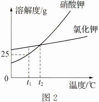科学思维 (2024·内蒙古)$t_1$℃时,将等质量的硝酸钾和氯化钾分别加入盛有 100g 水的两个烧杯中,充分搅拌后如图 1 所示,硝酸钾和氯化钾的溶解度曲线如图 2 所示。下列说法不正确的是 (