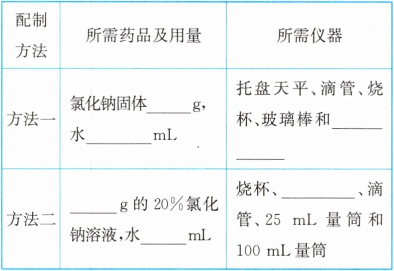 解析:方法一:需要氯化钠固体的质量为 $ 100g × 16\% = 16g $;需要水的质量为 $ 100g - 16g = 84g $,合 84mL;量取 84mL 水需要 100mL 量筒。方法二:设需要 20%的氯化钠溶液的质量为 $ x $,根据稀释前后溶质质量不变,则 $ x × 20\% = 100g × 16\% $,解得 $ x = 80g $,即需要 80g 20%的氯化钠,需要水的质量为 $ 100g - 80g = 20g $,则需要水的体积为 $ 20g ÷ 1g · mL^{-1} = 20mL $,此时还需要玻璃棒搅拌。