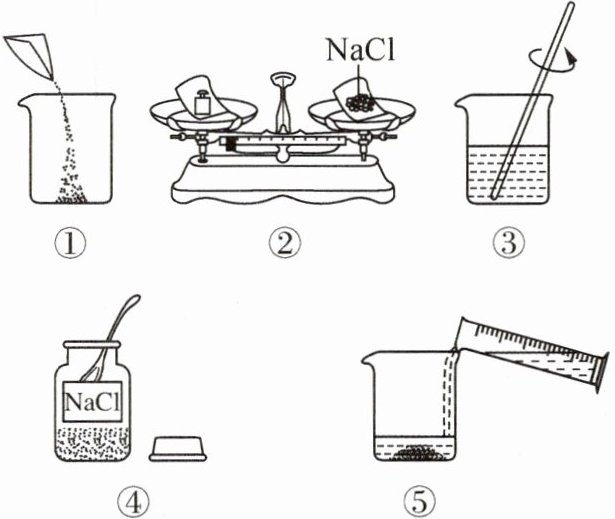 解析:(3) 砝码生锈,砝码质量偏大,称得试剂质量偏大,会使配制溶液溶质质量分数偏大,故①不符合题意;图 B 是仰视读数,会导致量取的水体积偏大,溶剂质量偏大,溶质质量分数偏小,故②符合题意;将量筒中的水倒入烧杯时,有水洒出,溶剂质量偏小,溶质质量分数偏大,故③不符合题意;称量 4.2g 氯化钠需使用游码,试剂与砝码放反了,称得氯化钠的质量偏小,溶质质量分数偏小,故④符合题意;溶液具有均一性,少量溶液洒落,溶质质量分数不变,故⑤不符合题意。