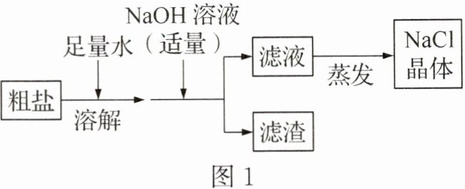 9. (2024·四川达州改编)海水中含有丰富的化学资源,可提取食盐。图 1 是粗盐提纯的部分流程,粗盐中的杂质有泥沙、氯化镁,回答下列问题[已知 2NaOH + MgCl₂ = Mg(OH)₂↓ + 2NaCl]。