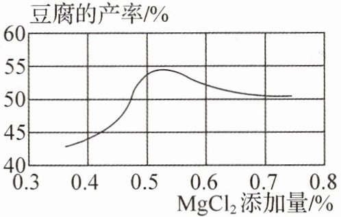 情境素材 (2025·山西大同模拟)传统豆腐制作要用卤水点浆,卤水通常是将氯化镁与水以 $1:4$ 的比例配制而成的。氯化镁添加量与豆腐的产率关系密切。结合图表信息,下列说法正确的是(