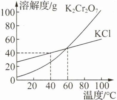 C 解析:没有指明温度,无法比较 ${K_{2}Cr_{2}O_{7}}$ 和 ${KCl}$ 的溶解度,故 A 错误;由题图可知,$40^{\circ}C$ 时,${KCl}$ 的溶解度为 $40g$,所以 $40^{\circ}C$ 时,将 $50g\ {KCl}$ 加入 $100g$ 水中,最多溶解 $40g$,所得溶液质量为 $40g + 100g = 140g$,故 B 错误;${K_{2}Cr_{2}O_{7}}$ 的溶解度受温度变化的影响较大,${KCl}$ 的溶解度受温度变化的影响较小,除去 ${K_{2}Cr_{2}O_{7}}$ 中混有的少量 ${KCl}$,可采用降温结晶的方法,故 D 错误。