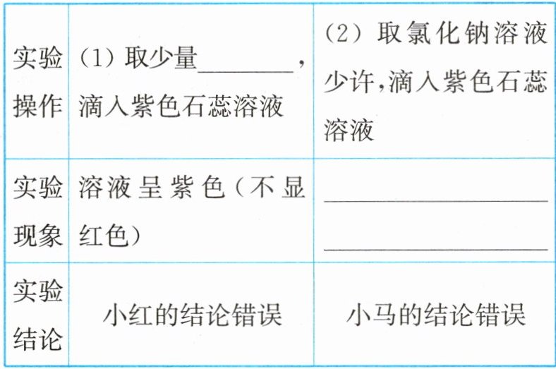 ;此时,小静提出疑问:小东的结论不一定正确,还有可能是H⁺和Cl⁻二者共同作用使石蕊变红色。老师表扬了小静,并指出小东的结论是正确的。为了排除小静的异议,老师建议补充一个实验:可以选择一种只含有