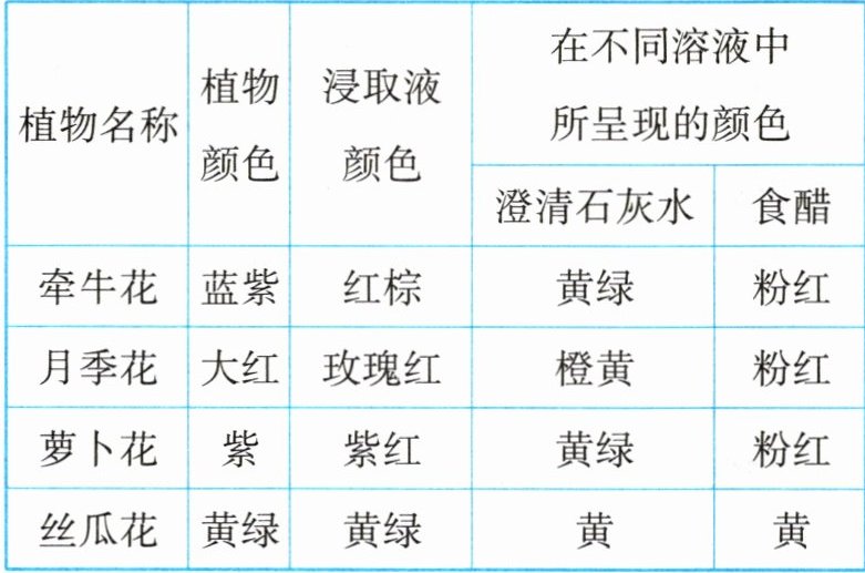 科学探究与实践 某活动类题小组分别用蓝色牵牛花、大红色月季花、紫萝卜花、丝瓜花提取指示剂。