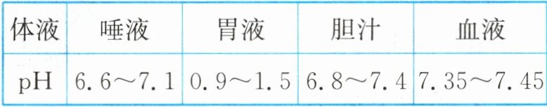 学科融合(教材P47表8-2改编)健康人的体液pH必须维持在一定的范围内。如果体液pH超越正常范围,就会导致生理功能失调或发生疾病。下表是人体中几种体液的正常pH范围。