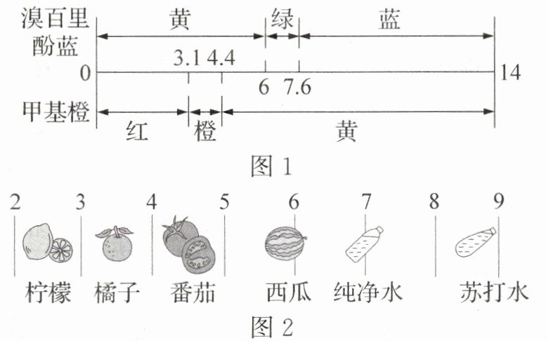 5. 亮点原创 图1是甲基橙和溴百里酚蓝在不同pH下的显色情况。图2中能使二者都显示黄色的是(