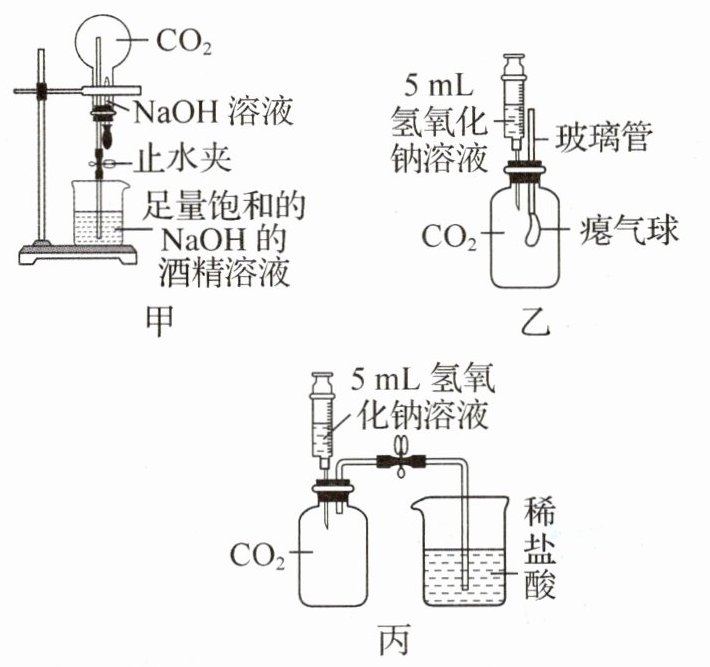 $CO_{2}+2NaOH=Na_{2}CO_{3}+H_{2}O (2) $针筒回到8mL处 氢氧化钠溶液中含有水,二氧化碳能溶于水也可以与水反应 等质量的水 (3) 稀盐酸倒吸入集气瓶中,且集气瓶中有气泡产生 (4) 甲、丙