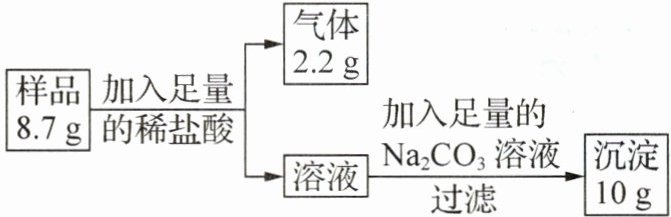 x $$2.2g$$\frac {100}{44}=\frac {x}{2.2g}$$ $$x=5g$$,该样品中$$CaCO_{3}$$的质量为5g,故A正确。样品中加入足量的盐酸后,含钙物质全部转化为氯化钙,氯化钙与碳酸钠反应生成碳酸钙沉淀,则生成的碳酸钙沉淀质量为10g,根据质量守恒定律,化学反应前后元素的种类和质量均不变,样品中的钙元素全部转移到$$CaCO_{3}$$中,则样品中钙元素的质量为$$10g× \frac {40}{100}× 100\% =4g$$;原样品5g碳酸钙中含有钙元素的质量为$$5g× \frac {40}{100}× 100\% =2g$$,原样品中其他成分的质量为$$8.7g - 5g = 3.7g$$,若固体全部是氧化钙,则氧化钙的质量为$$2g÷ (\frac {40}{56}× 100\% ) = 2.8g < 3.7g$$;若固体全部是氢氧化钙,则氢氧化钙的质量为$$2g÷ (\frac {40}{74}× 100\% ) = 3.7g$$,因此该样品中只含有$$Ca(OH)_{2}$$和$$CaCO_{3}$$,不含氧化钙,因此,该样品没有干燥作用,故B错误,C、D正确。
