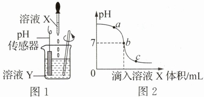 4. (2025·山东烟台)为验证${NaOH}$溶液和稀盐酸能够发生反应,兴趣小组用图1所示装置进行实验,烧杯内溶液的${pH}$随滴入溶液${X}$体积变化的曲线如图2所示。下列说法错误的是(