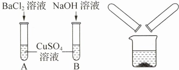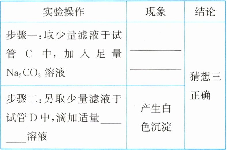解析:(2) 实验结束后,将两个实验后的废液倒入同一干净的烧杯中,充分混合后过滤,得到滤液呈无色,则滤液中一定不含铜离子,则说明B中氢氧化钠溶液过量,氯化钡与硫酸钠反应生成硫酸钡沉淀和氯化钠,硫酸铜与氢氧化钠反应生成氢氧化铜沉淀和硫酸钠,氯化铜与氢氧化钠反应生成氯化钠和氢氧化铜沉淀,取少量滤液于试管中,滴入紫色石蕊溶液,溶液仍为紫色,说明溶液呈中性。则滤渣中一定含有的是氢氧化铜、硫酸钡。(3) 硫酸铜与氢氧化钠反应生成氢氧化铜沉淀和硫酸钠,氯化铜与氢氧化钠反应生成氯化钠和氢氧化铜沉淀,则猜想三是氯化钠和硫酸钠。取少量滤液于试管C中,加入足量Na₂CO₃溶液,观察到无明显现象,则溶液中无氯化钡;氯化钡与硫酸钠反应生成硫酸钡白色沉淀和氯化钠,则另取少量滤液于试管D中,滴加适量氯化钡溶液,可以观察到有白色沉淀产生,则说明含有硫酸钠,即猜想三成立。