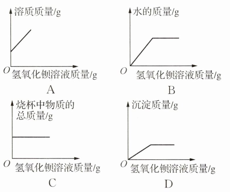 答案:7. D 解析:在刚开始加入氢氧化钡溶液时,稀硫酸与氢氧化钡反应生成硫酸钡沉淀和水,溶质的质量不断减小,到完全反应后再加入氢氧化钡溶液,溶质的质量才开始慢慢增大,故A错误;稀硫酸中含有水,曲线不会从原点开始,由于反应有水生成,且稀硫酸和氢氧化钡溶液中都含有水,所以水的质量不断增大,且前期比后期的增幅更大,故B错误;随着氢氧化钡溶液的不断加入,烧杯中物质的总质量在不断增大,故C错误;稀硫酸与氢氧化钡溶液反应生成硫酸钡沉淀和水,当硫酸反应完后,沉淀的质量不再改变,故D正确。