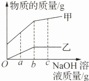 答案:8. B 解析:稀盐酸和氢氧化钠反应生成氯化钠和水,随着反应进行,氯化钠质量从0开始增加,反应结束后不再变化,所以乙表示氯化钠的质量,而甲表示水的质量,因为稀盐酸含有水,水的初始质量不为0,氢氧化钠溶液含有水,反应生成水,随着氢氧化钠溶液的加入,水的质量不断增加,反应结束后继续滴加氢氧化钠溶液,水的质量还会增加,增加的幅度比前期小,故A错误;加入b g NaOH溶液时,氯化钠的质量刚好达到最大值,说明此时稀盐酸和氢氧化钠恰好完全反应,所得溶液为氯化钠溶液,溶液呈中性,pH=7,故B正确;加入c g NaOH溶液时,氢氧化钠过量,溶液的溶质是NaCl、NaOH,溶液中的阴离子为Cl⁻和OH⁻,故C错误;加入a g氢氧化钠溶液时,由题图可知,氯化钠的质量未达到最大值,说明稀盐酸未反应完,溶液呈酸性,向所得溶液中加入酚酞,溶液不变色,故D错误。