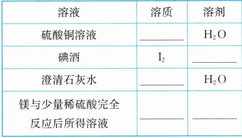 7. (教材 P11 表 7 - 5 改编)写出下列溶质或溶剂的化学式。