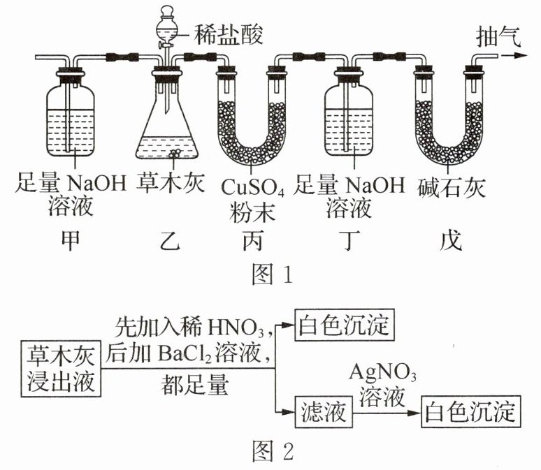 (3) 为确定草木灰是否含有K₂SO₄和KCl,小金取适量草木灰于烧杯中,加足量水浸泡;取少量浸出液于试管中,进行如图2操作。