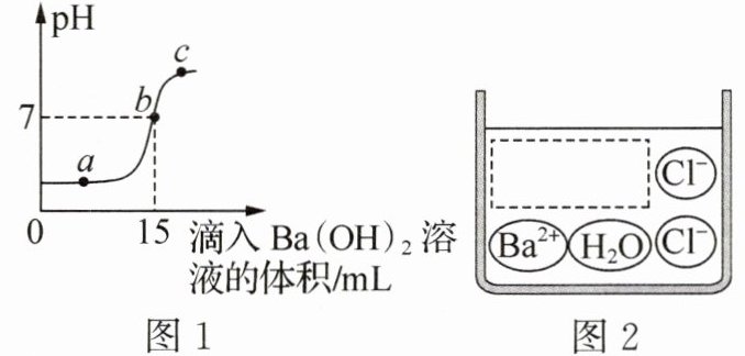宏观微观结合(2025·重庆模拟)某同学在常温下进行 Ba(OH)₂溶液和稀盐酸发生中和反应的实验探究,利用数字化传感器,借助计算机绘制出图 1 曲线,图 2 为 c 点时溶液中的微观粒子示意图。下列说法正确的是(