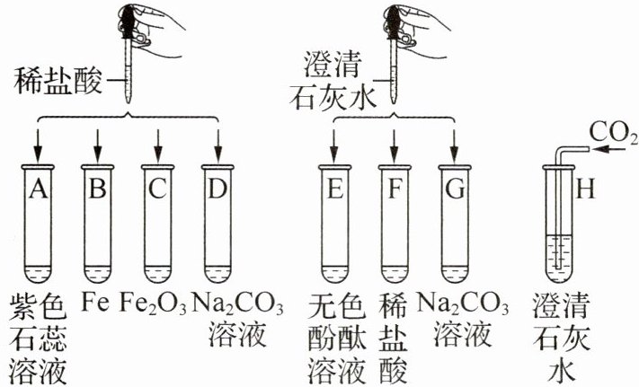 6. (2025·浙江杭州月考)某科学实验小组欲探究盐酸、氢氧化钙的化学性质,取 8 支试管分别用 A~H 编号后,做了如图实验。