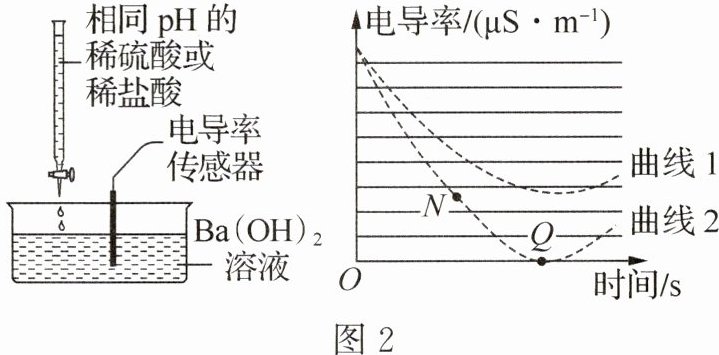 (3)分别向两份相同的 Ba(OH)₂溶液中匀速滴加相同 pH 的稀盐酸和稀硫酸,观察现象并绘制溶液电导率随时间变化曲线(如图 2)。已知电导率能衡量溶液导电能力大小,相同条件下,单位体积溶液中的离子总数越多,电导率越大。