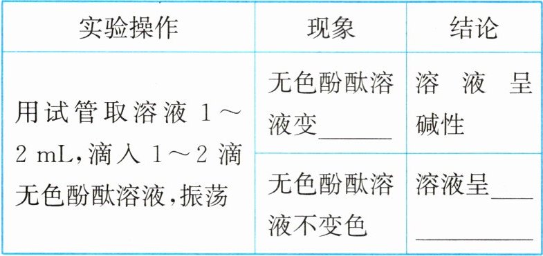 答案:7. 【作出猜想】中 酸(此两空可互换) 【实验验证】红色 酸性或中性 【分析与思考】(1)${OH^{-}}$ (2)方案一:溶液由无色变红色 方案二:${Zn + 2HCl = ZnCl_{2} + H_{2}\uparrow}$ 方案三:溶液由无色变成蓝色 ${CuO + 2HCl = CuCl_{2} + H_{2}O}$