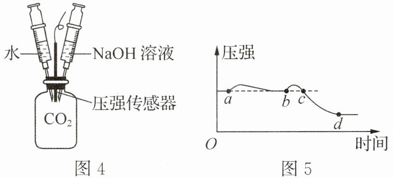 利用气密性良好的装置(图 4)进行实验。打开传感器,待压强平稳后将水匀速注入充满的集气瓶中,压强稳定后再匀速注入等体积的 NaOH 溶液。测得气体压强变化如图 5 所示。